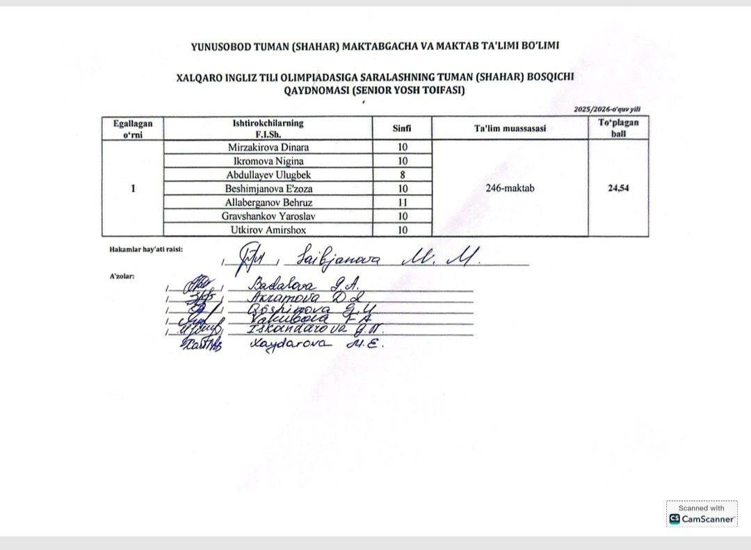 ELO-2026 xalqaro ingliz tili olimpiadasining ikkinchi bosqichida 246-maktab jamoasi 1-o‘rinni egallab shahar bosqichiga yo‘l oldi