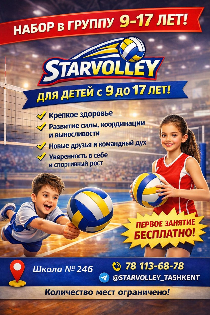 Открыт набор детей 9–17 лет в школу волейбола STARVOLLEY ⭐️ Это не просто тренировки — это: 💪 крепкое здоровье ⚡️ развитие силы, координации и выносливости 🤝 новые друзья и командный дух 🏆 уверенность в себе и спортивный рост 📍 Тренировки проходят в...